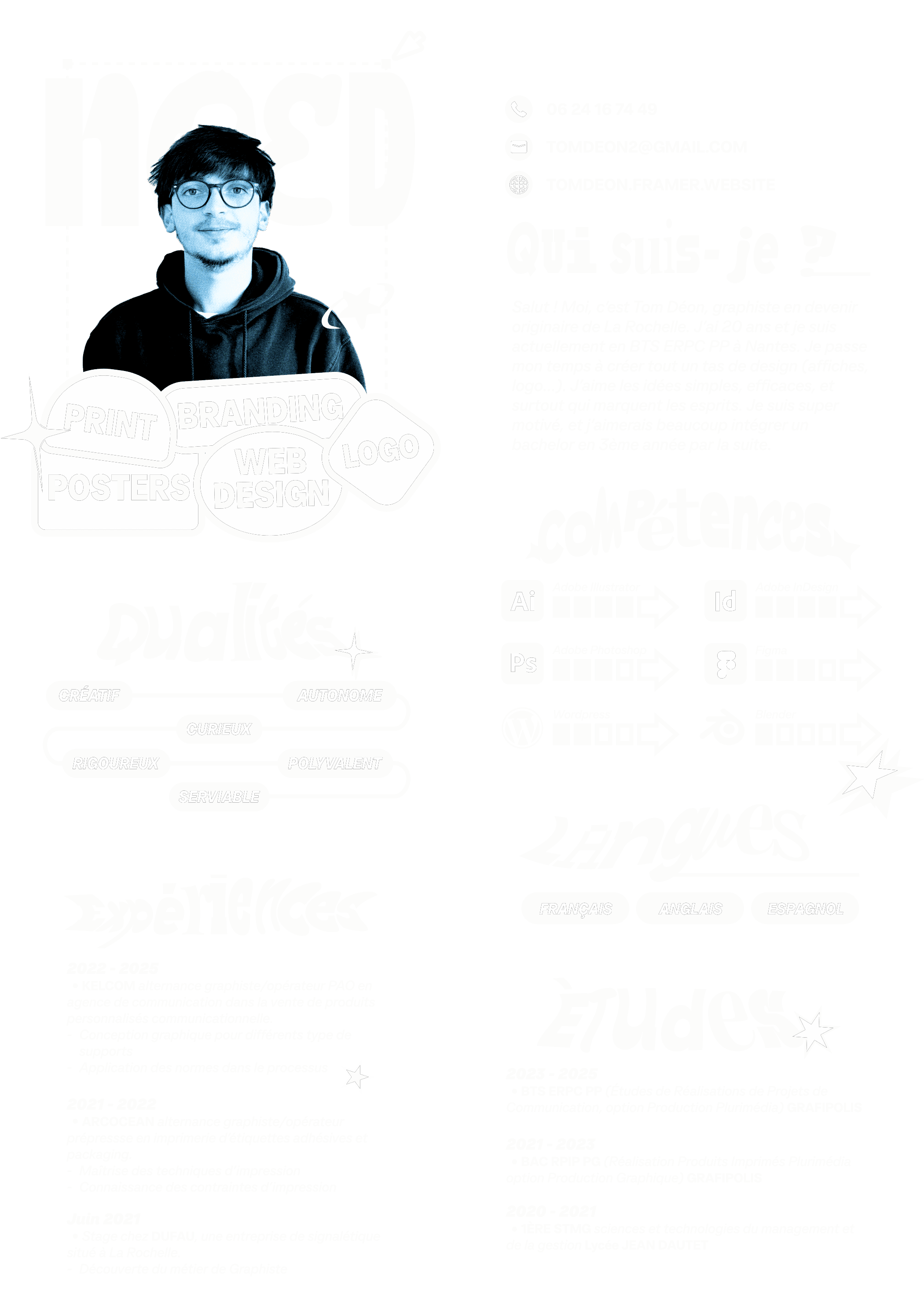 Spécialisé dans le design imprimé, je conçois des supports visuels impactants, qu’il s’agisse d’affiches, de brochures, de flyers ou de packaging. J’apporte une approche visuelle originale et adaptée aux besoins variés de chaque projet.