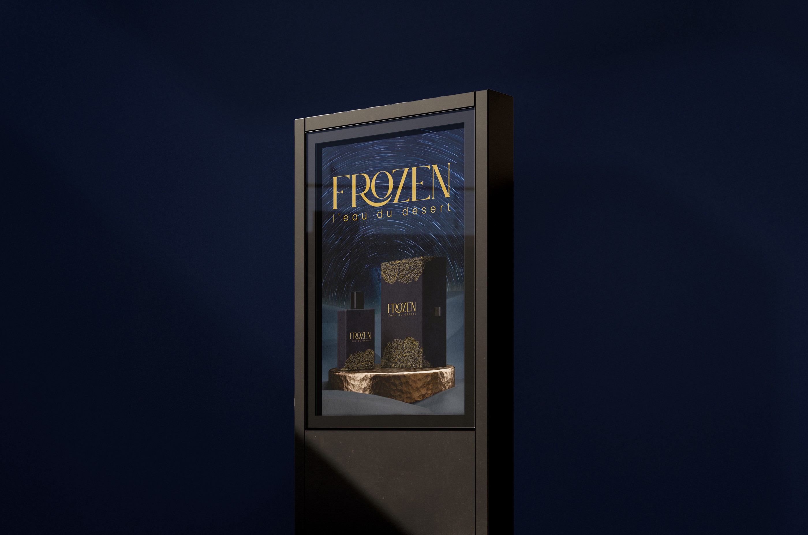 Dans le cadre de mon BTS, j’ai travaillé sur la création d’un nouveau parfum pour la marque Rituals, appelé "Frozen, l’eau du désert". Le projet comprenait la conception du flacon, du packaging et de l’identité visuelle pour que le produit s’intègre bien à l’image de la marque. L’idée était de jouer sur des éléments qui rappellent à la fois le désert et la fraîcheur de l’eau, pour donner un côté moderne et cohérent à l’ensemble.